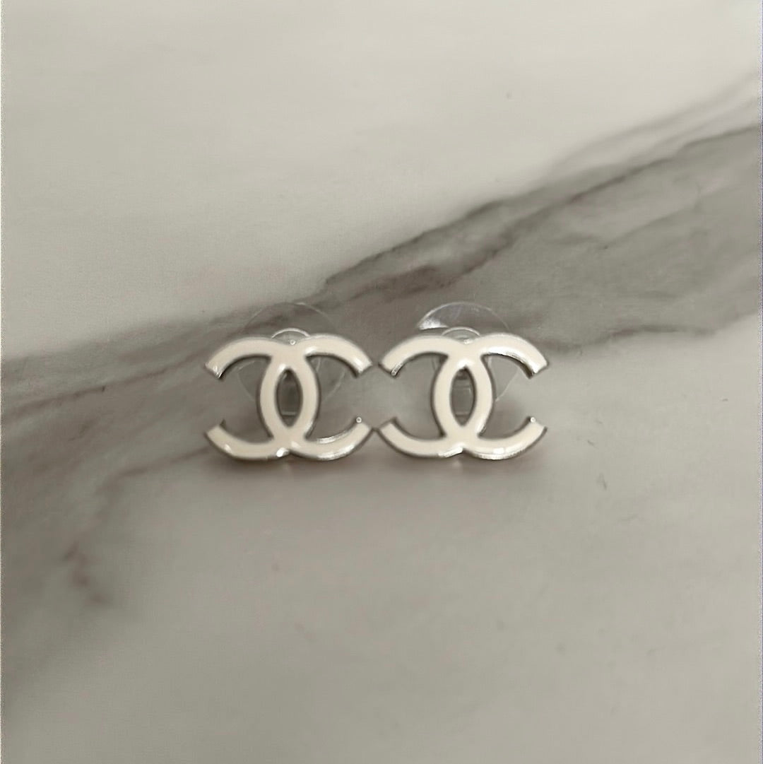 Chanel CC Earrings white gold plated with white enamel. These earrings have a post so are for pierced ears. Preowned in a Chanel box.